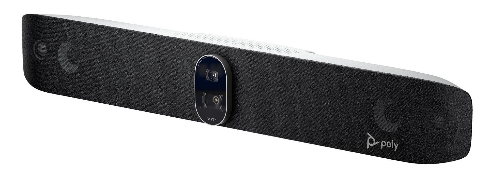 Barre vidéo Poly V72 intégrant 2 lentilles avec résolutions 4K , champs de vision de 120° et 78°, Zoom numérique de 7,3x , microphones avec captation jusqu’à 25 pieds et 4 hauts parleurs stéréo haute qualité.