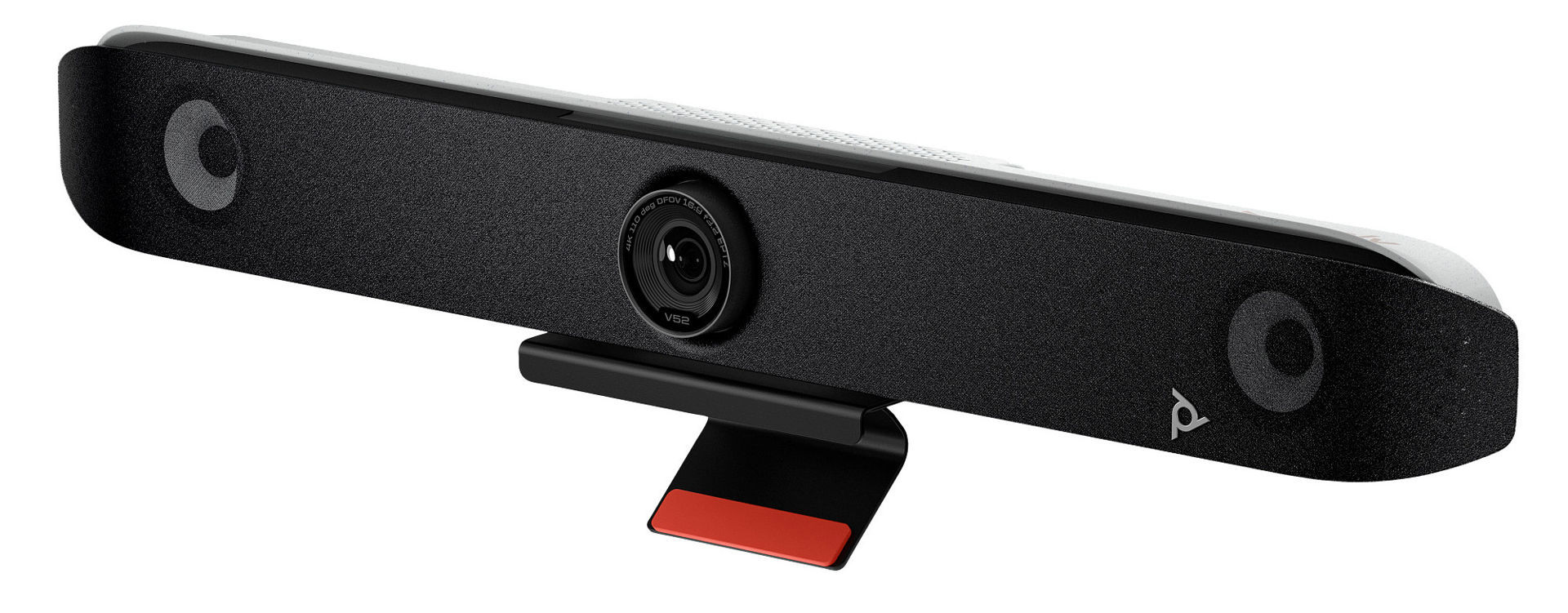 Barre vidéo Poly V52 Intégrant caméra 4K avec zoom 5x et champ de vision de 95°, microphones avec captation jusqu’à 20 pieds et hauts parleurs stéréo haute qualité.